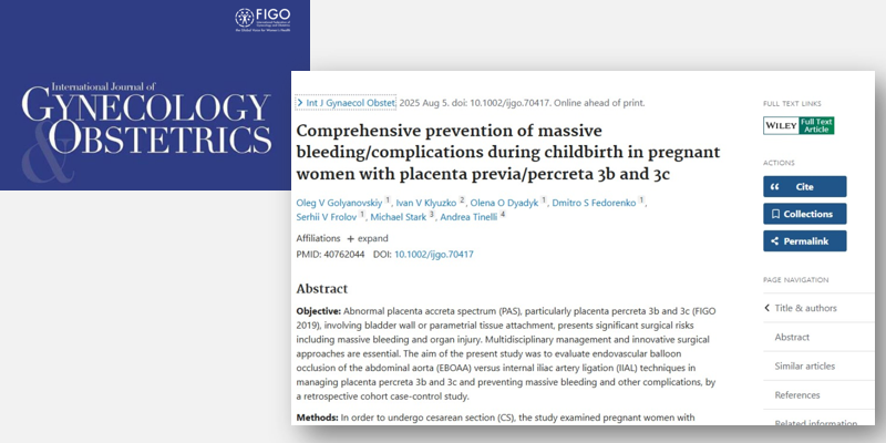 We are proud to announce that the faculty members of the Department of Obstetrics and Gynecology of Shupyk National Healthcare University of Ukraine, as part of an international research team, have published the article “Comprehensive Prevention of Massive Bleeding/Complications During Childbirth in Pregnant Women with Placenta Previa/Percreta 3B & 3C” in the highly respected International Journal of Gynecology and Obstetrics (Impact Factor: 4.88). This journal is the official publication of FIGO (International Federation of Gynecology and Obstetrics) and holds significant authority in the global medical community.