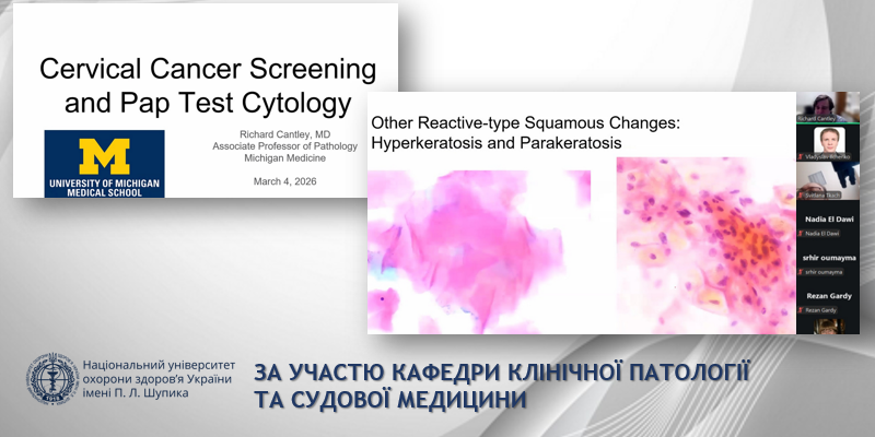 Кафедра клінічної патології та судової медицини НУОЗ України імені П. Л. Шупика спільно з міжнародними партнерами провела дистанційну лекцію, під час якої експерт Університету Мічигана представив сучасні підходи до цитологічного скринінгу раку шийки матки та інтерпретації результатів ПАП-тесту.