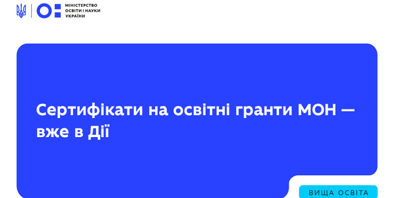 Міністерство освіти і науки України повідомляє, що з 24 вересня 2025 року, здобувачам вищої освіти 2025 року вступу почали надходити в застосунок Дія електронні сертифікати на освітні гранти. Підтвердження грантів триватиме до 25 жовтня. На початку жовтня гранти почнуть надходити й здобувачам минулого року вступу.
