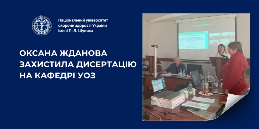 На кафедрі управління охороною здоров’я 25 вересня 2025 року проведено засідання разової спеціалізованої вченої ради ДФ 26.613.239 для захисту дисертації на здобуття ступеня доктора філософії в галузі знань I «Охорона здоров’я та соціальне забезпечення», спеціальність I-2 «Медицина» аспірантки кафедри акушерства, гінекології та медицини плода НУОЗ України імені П. Л. Шупика Жданової Оксани В’ячеславівни на тему: «Медико-соціальне обґрунтування концептуальної моделі комунікацій щодо формування здорового способу життя у молоді в Україні».