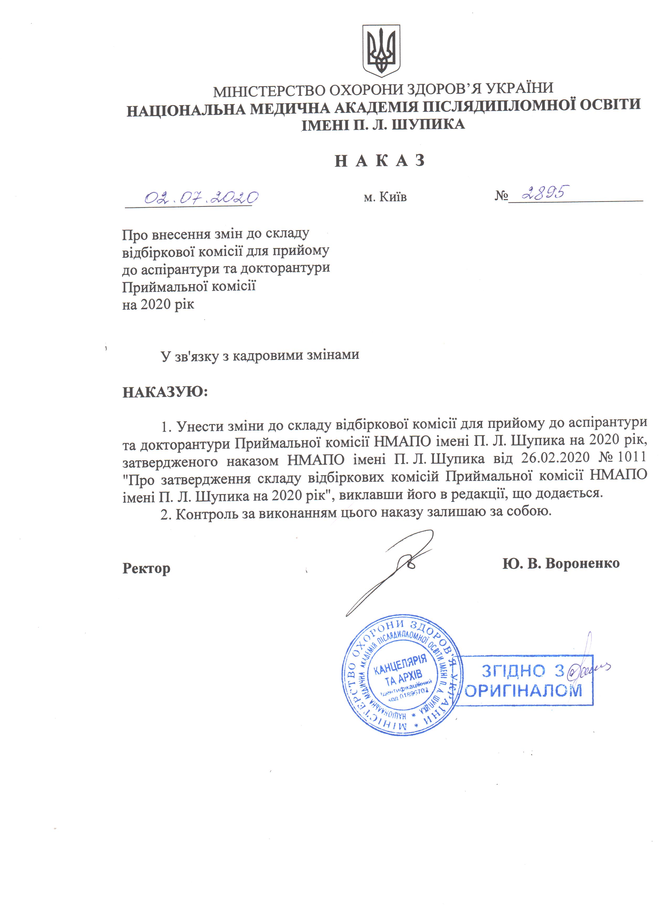 Зміни складу Приймальної комісії НУОЗ України імені П. Л. Шупика