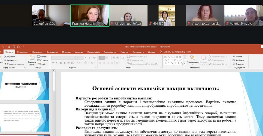 Блок, присвячений імунологічним основам вакцинопрофілактики, викладала доцент кафедри фармації Олена Трохименко, детально розглядаючи механізми функціонування імунної системи, типи імунітету, особливості формування імунної відповіді на різні типи антигенів та питання безпеки й переносимості вакцин. Розділ, присвячений економіці стратегій імунізації викладала доцент кафедри фармації Наталія Припута, приділивши увагу оцінці вартості програм вакцинації, методам економічного аналізу, підходам до моделювання витрат, а також питанням фінансування та раціонального розподілу ресурсів у сфері імунопрофілактики.
