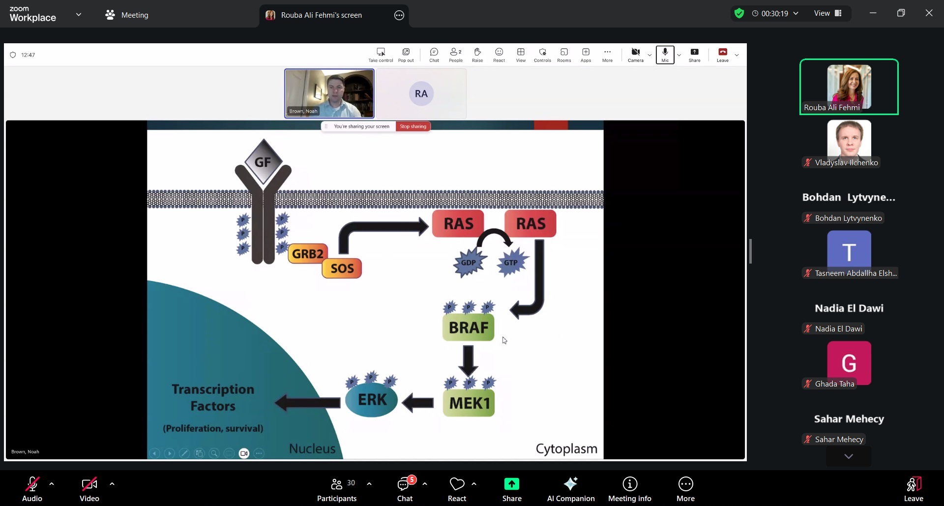 Далі професор Ali-Fehmi представила спікера - професора Noah Brown, директора Молекулярно-діагностичної лабораторії Дивізіону діагностичної генетики і геноміки Університету Мічігана. Професор Brown прочитав лекцію на надзвичайно актуальну тему: "Молекулярна патологія раку легень" (Lung Cancer Molecular Pathology).