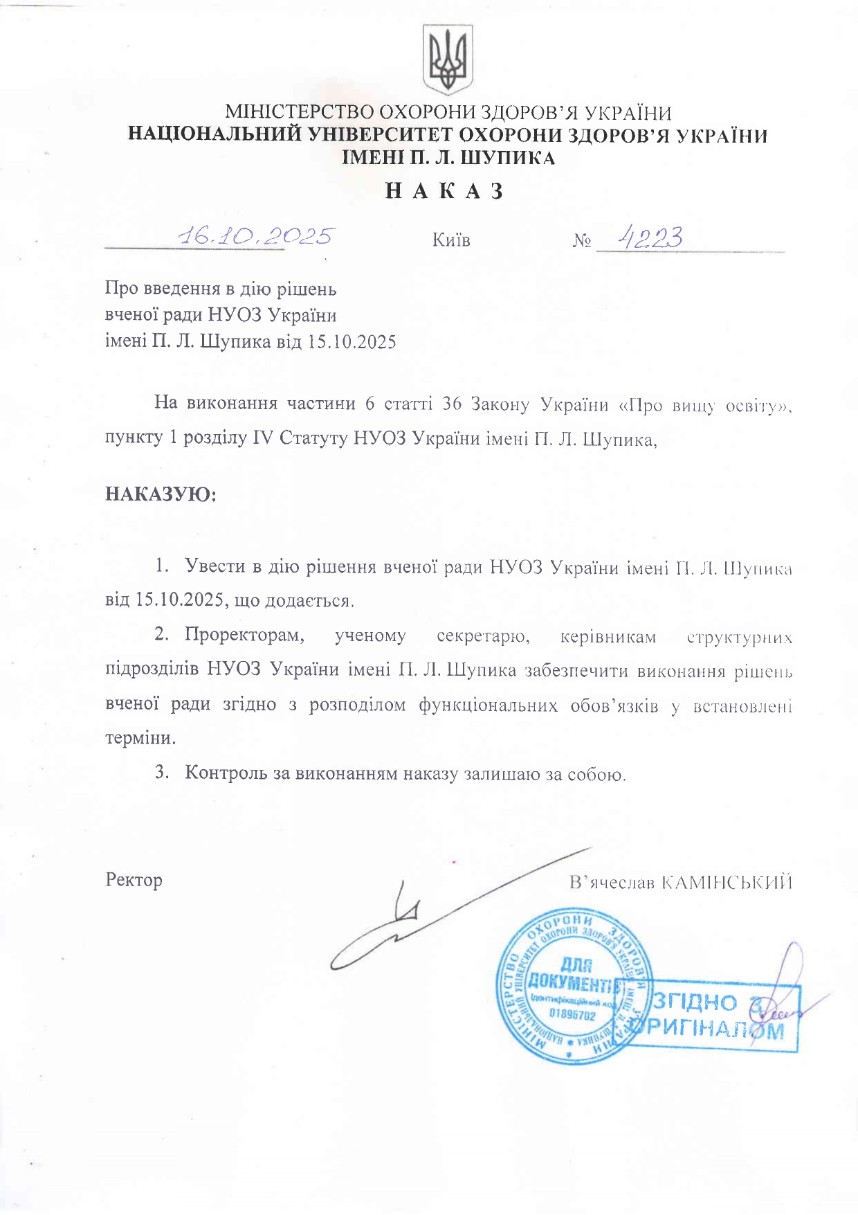 Наказ від 16.10.2025 № 4223 "Про введення в дію рішень вченої ради НУОЗ України імені П. Л. Шупика від 15.10.2025"
