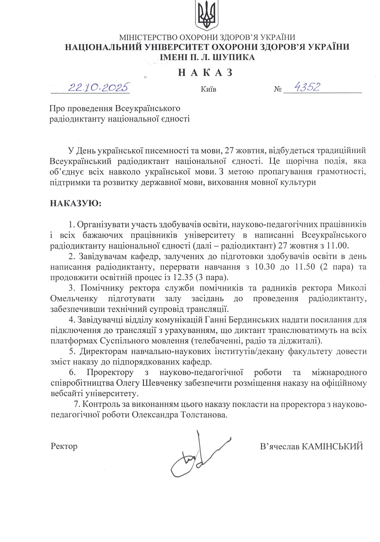 Наказ від 22.10.2025 № 4352 "Про проведення Всеукраїнського радіодиктанту національної єдності"