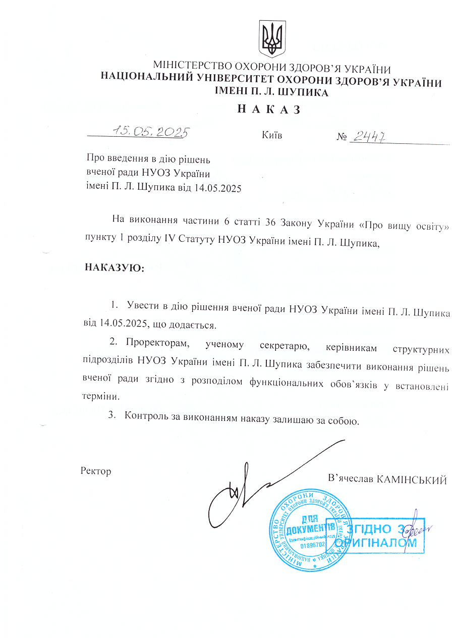 Наказ від 15.05.2025 № 2447 "Про введення в дію рішень вченої ради НУОЗ України імені П. Л. Шупика від 14.05.2025"