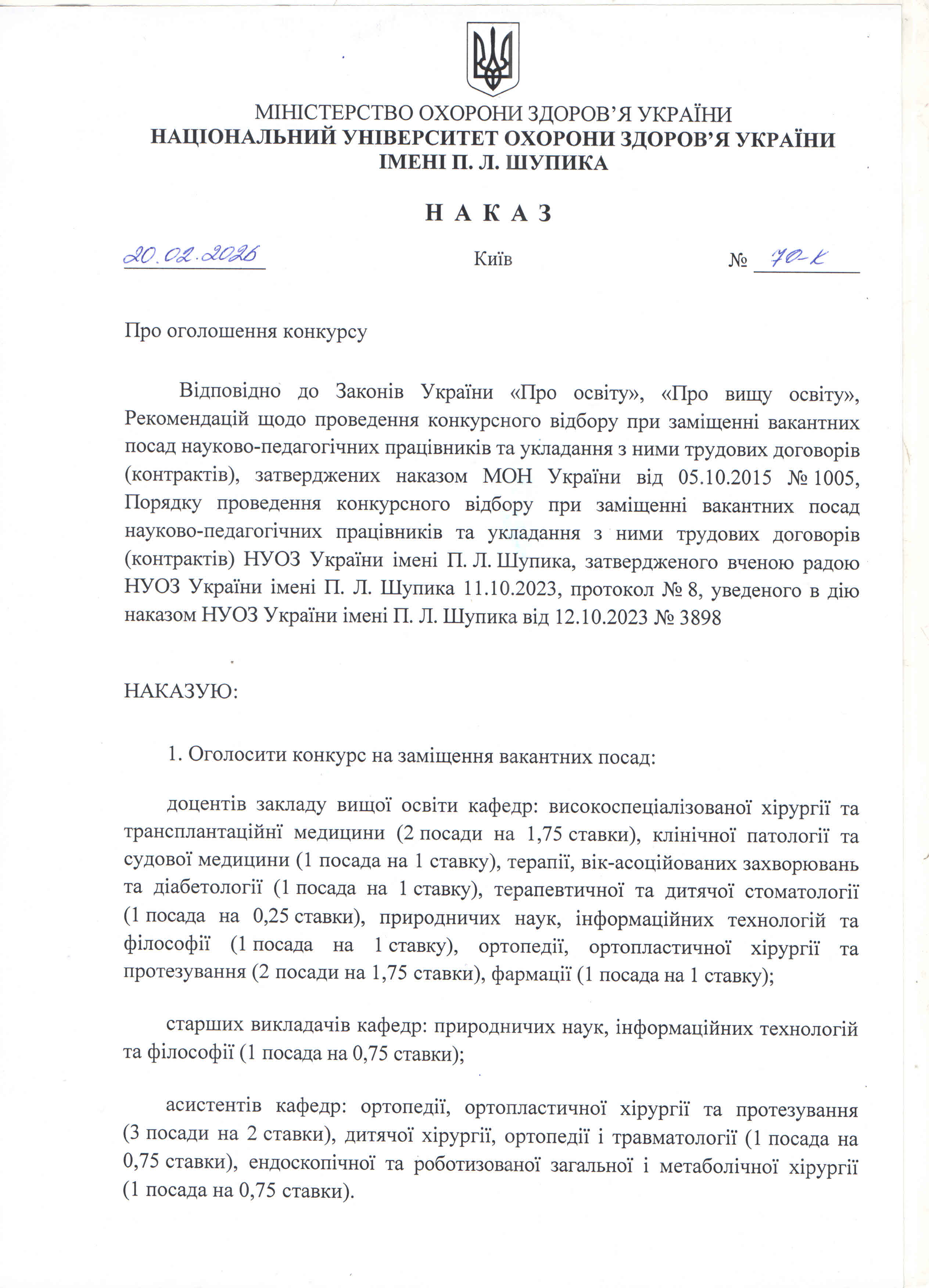 Наказ від 20.02.2026 № 70-к про оголошення конкурсу