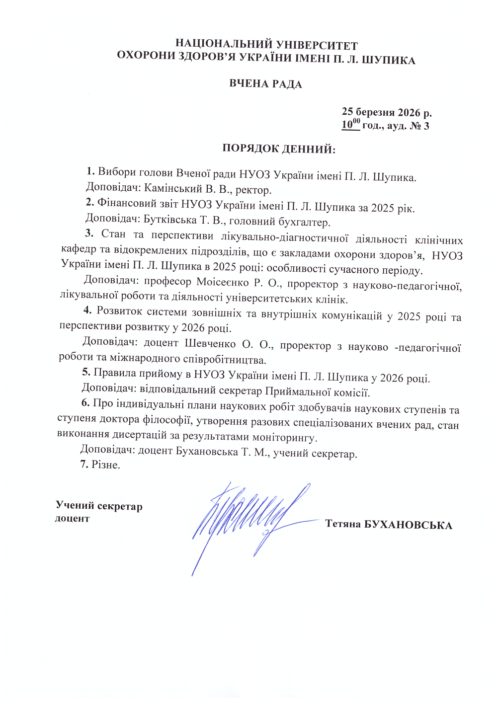 Порядок денний засідання Вченої Ради НУОЗ України імені П. Л. Шупика